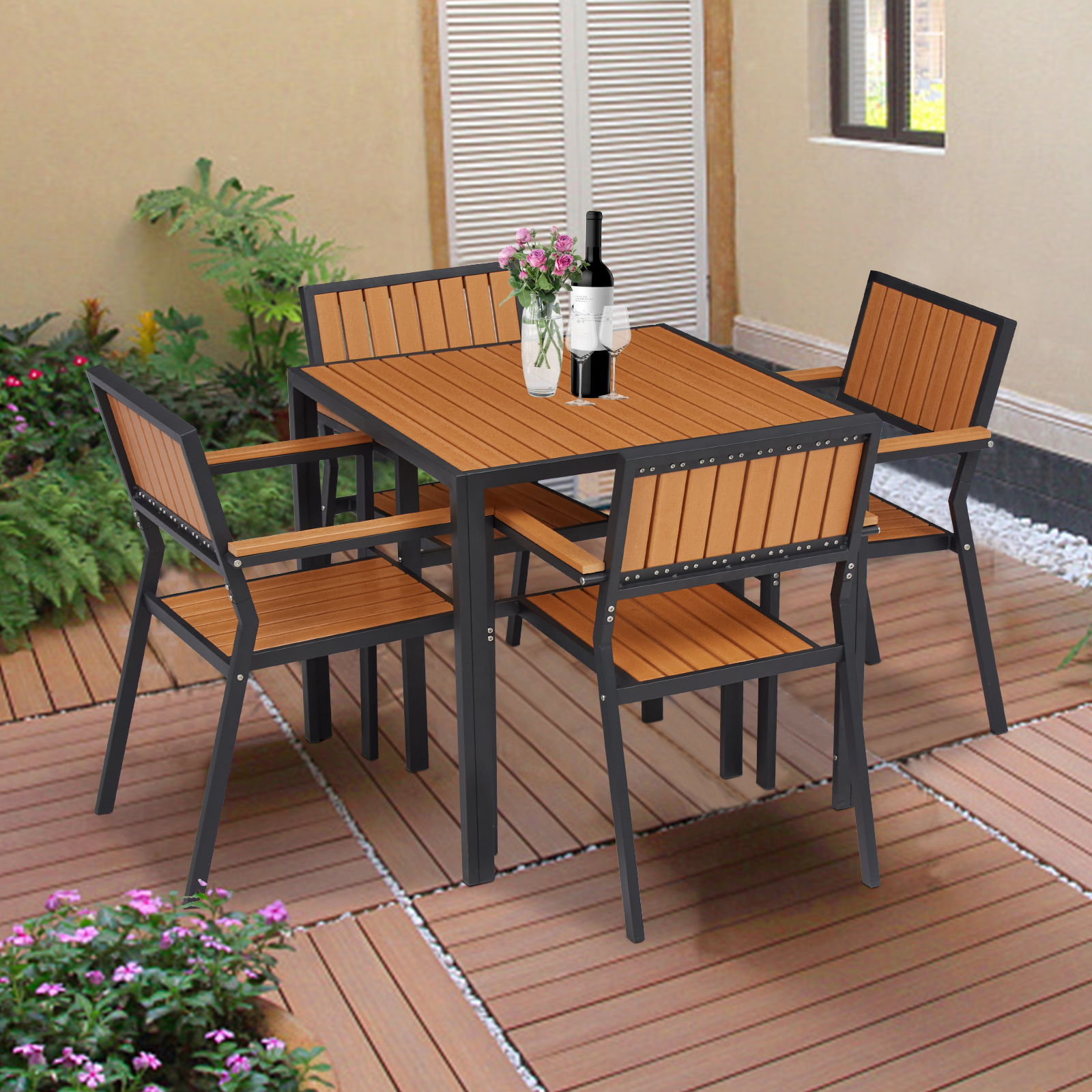 Kinbor 5pcs Outdoor Patio Dining Table and Chair Set W/ Steel Square Bistro Table 4 Armchairs, Brown