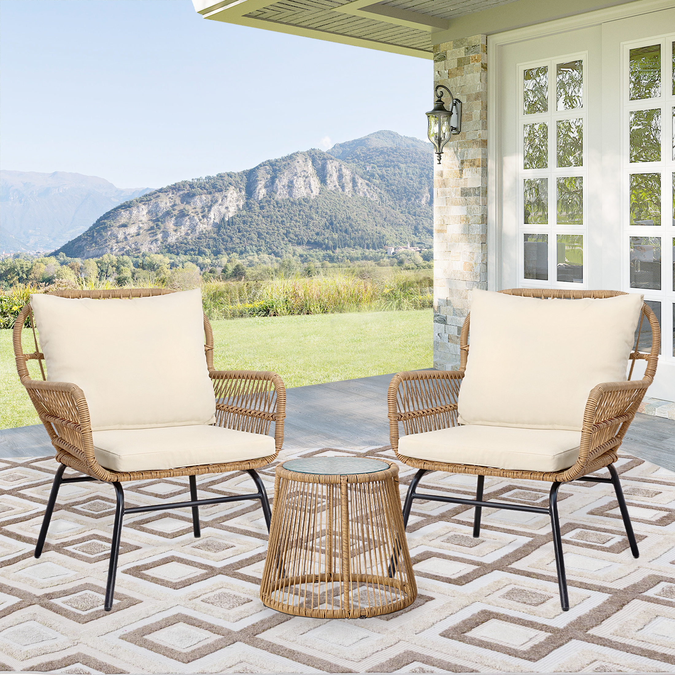 NICESOUL 3 Pcs Boho Outdoor Bistro Chair Sets with Coffee Table, Wicker Patio Furniture Cream
