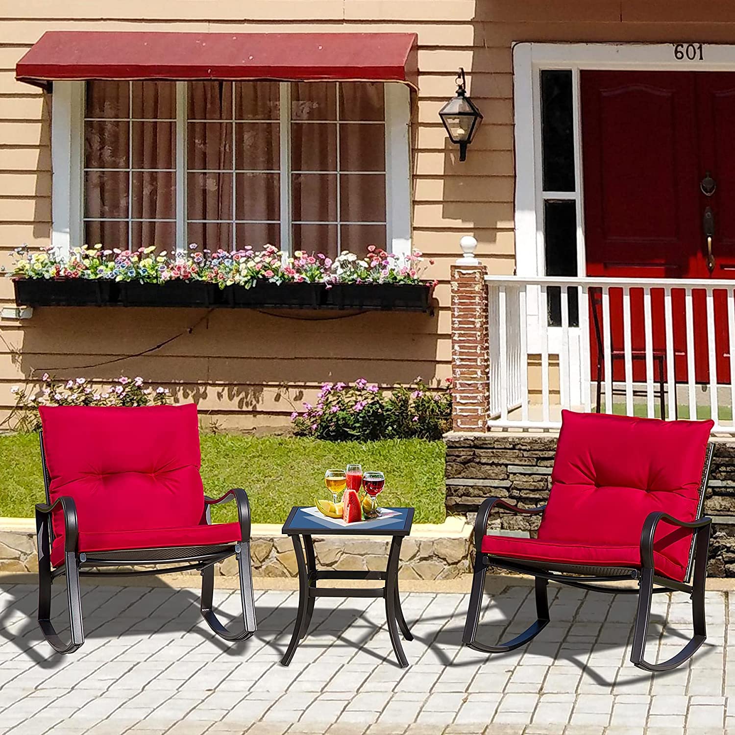 Domi Outdoor Living 3 Pieces Bistro Set Rocking Chairs Thickened Cushion and Glass Top Table (Red)
