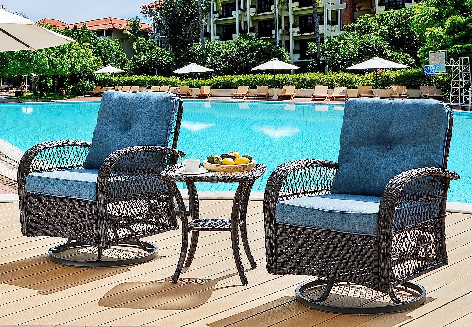 UDPATIO 3 Pieces Patio Furniture Set, Outdoor Swivel Gliders Rocker, Wicker Patio Bistro Set with Rattan Rocking Chair, Glass Top Side Table and Thickened Cushions for Porch Deck Backyard (Navy)