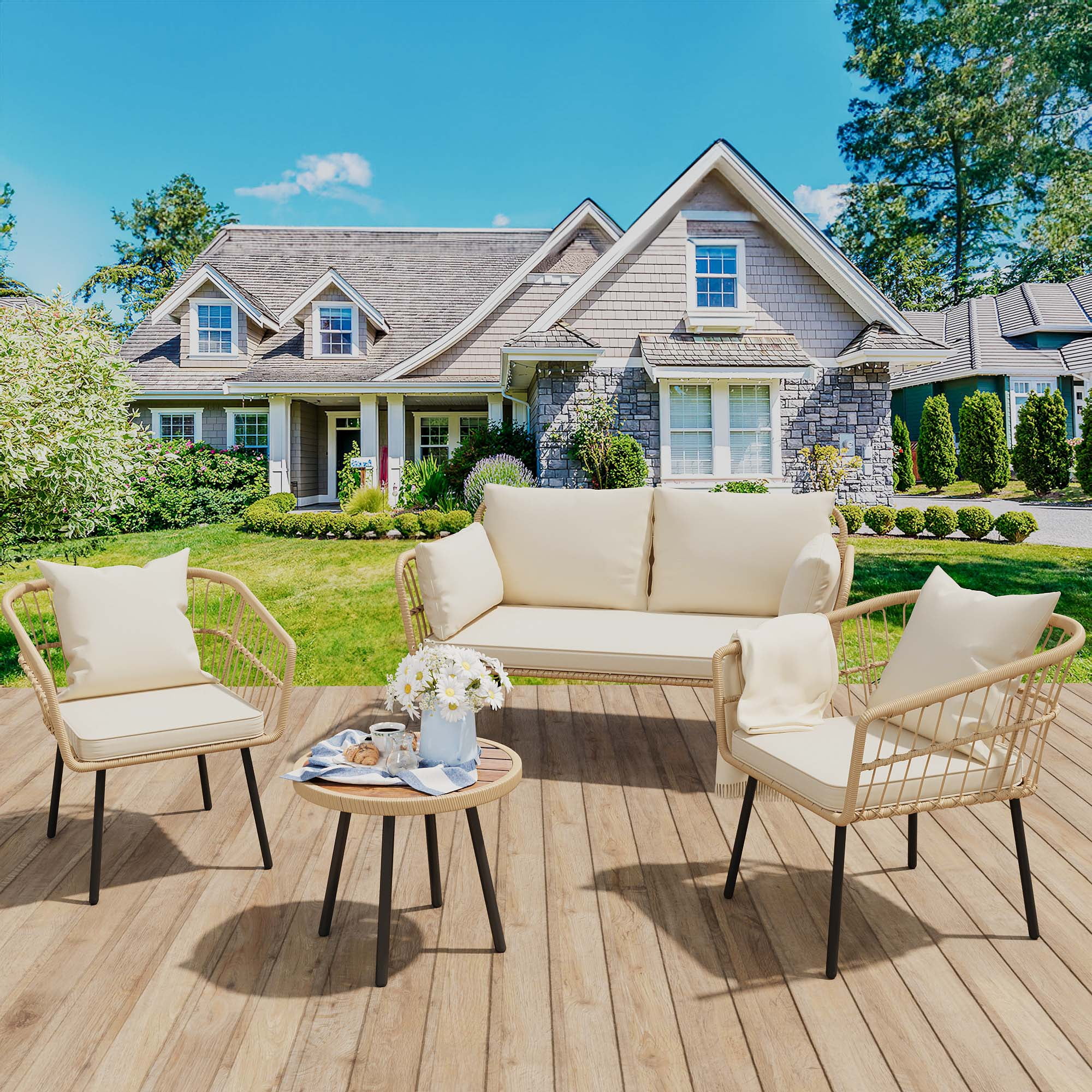 Dextrus 4-Piece Patio Furniture Wicker Outdoor Bistro Set, All-Weather Rattan Conversation Loveseat Chairs for Backyard, Balcony and Deck with Soft Cushions and Coffee Table - Beige