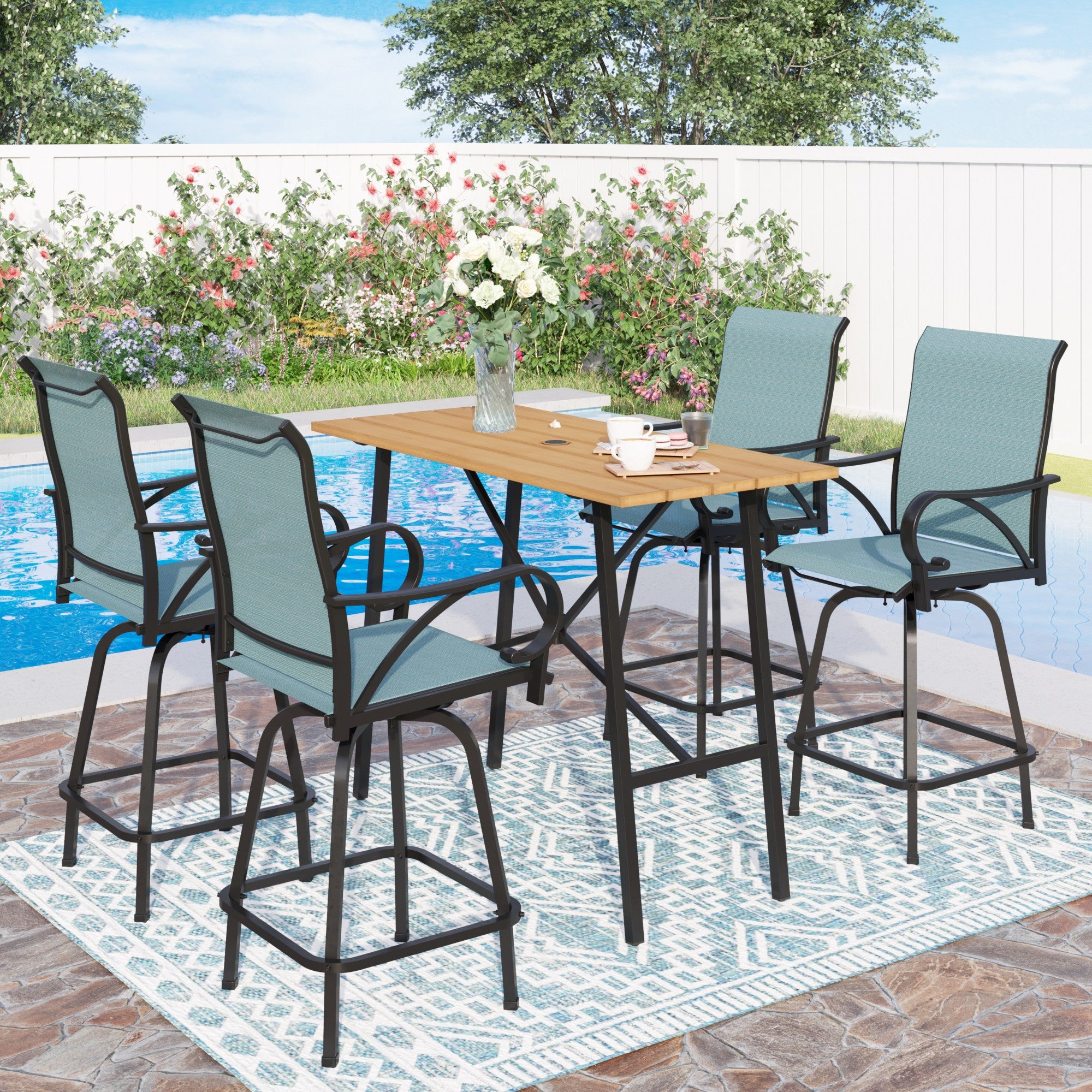 Summit Living Outdoor Swivel Bar Stool Dining Set of 5, 4 Patio High-Back Height Chairs and 1 Metal Bar Table, Black & Aqua