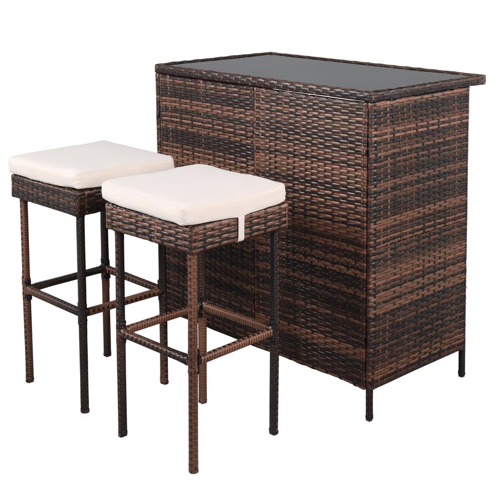 UBesGoo 3PCS Patio Rattan Wicker Bar Table Stools Dining Set Cushioned Chairs Garden Brown