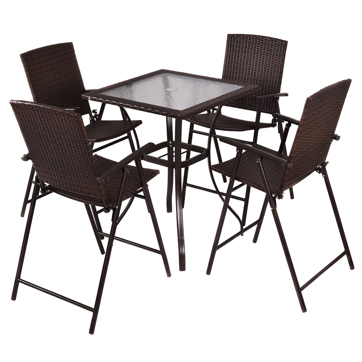 Costway 5PC Rattan Patio Furniture Set 4 Bar Stool Folding Chair and Bar Table W/Glass Top