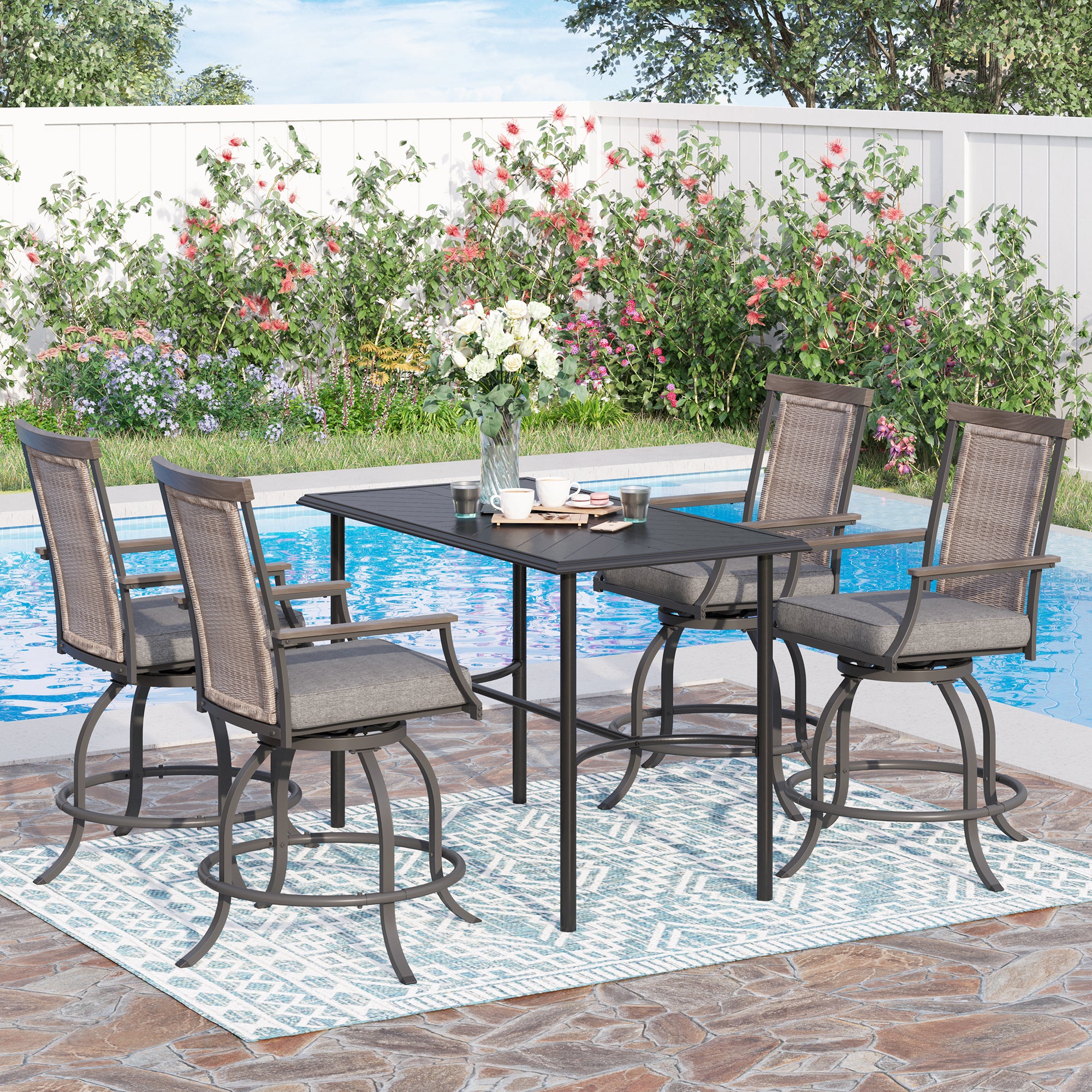 Summit Living 5-Piece Outdoor Patio Swivel Bar Stool Dining Set with 4 High Back Textilene Chairs with Armrest&1 Metal Bistro Bar Table,Black&Grey