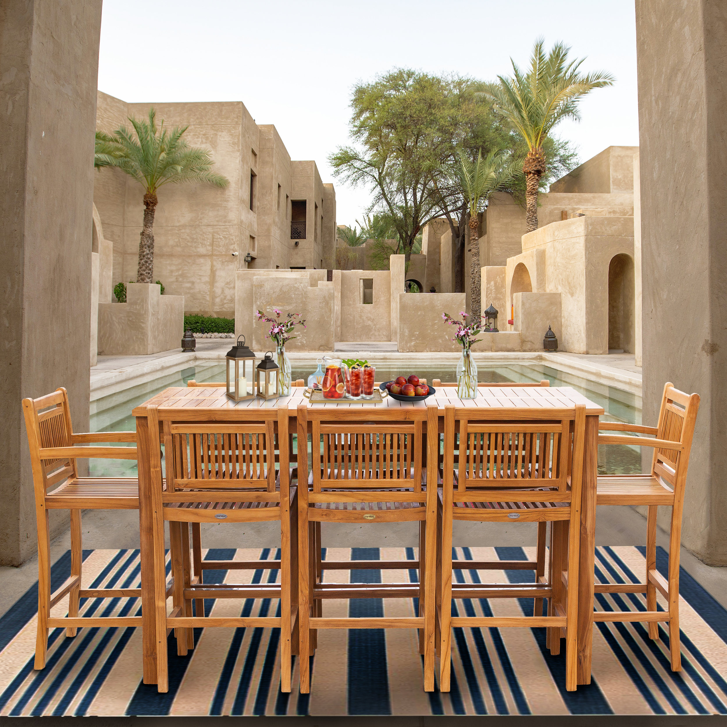 9 Piece Teak Wood Maldives Patio Bistro Bar Set, 71" Bar Table, 2 Bar Chairs with Arms and 6 Armless Bar Chairs