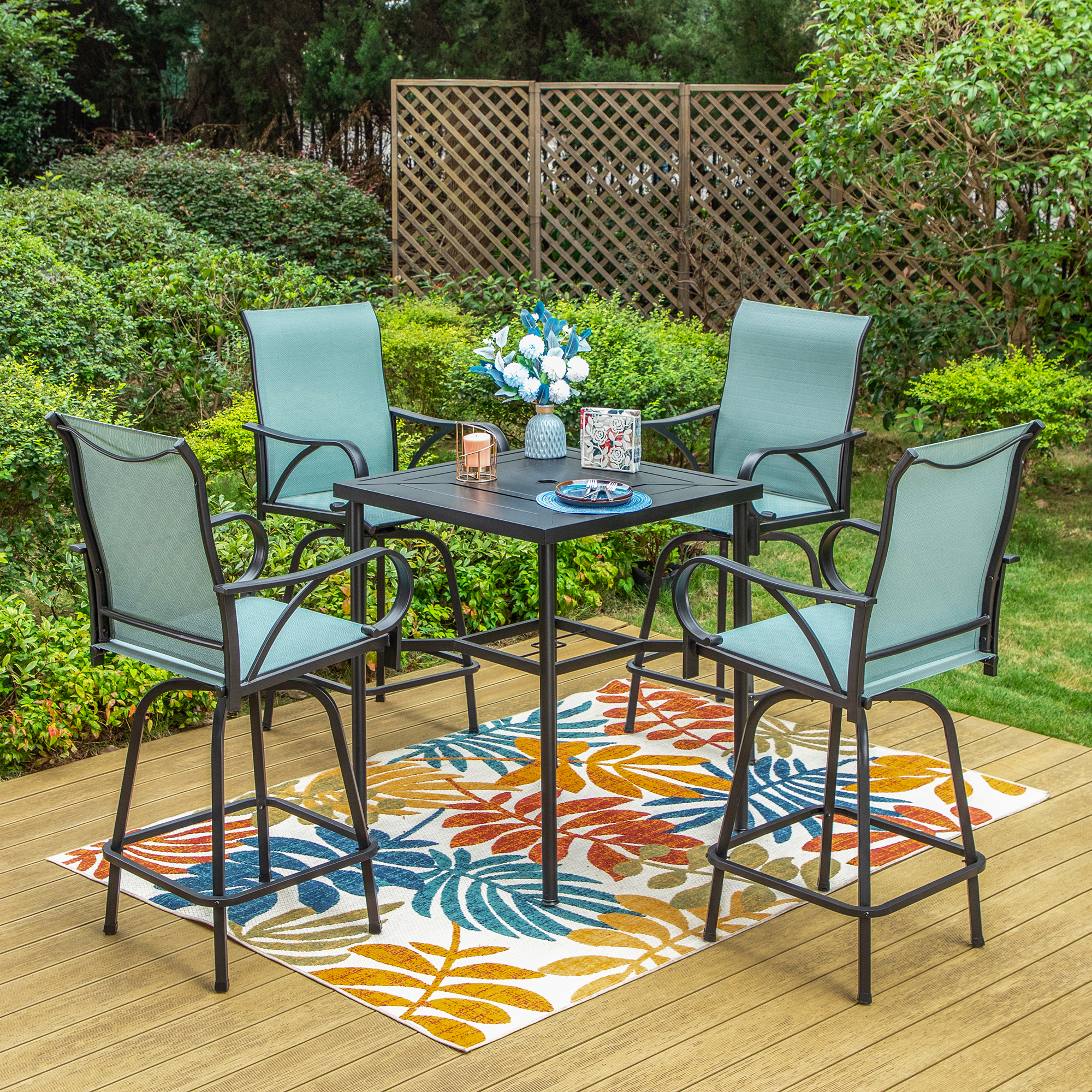 Summit Living 5 Pieces Outdoor Patio Swivel Bar Stool Dining Set,4 Metal High-Back Height Chairs and 1 Bar Table,Turquoise Blue