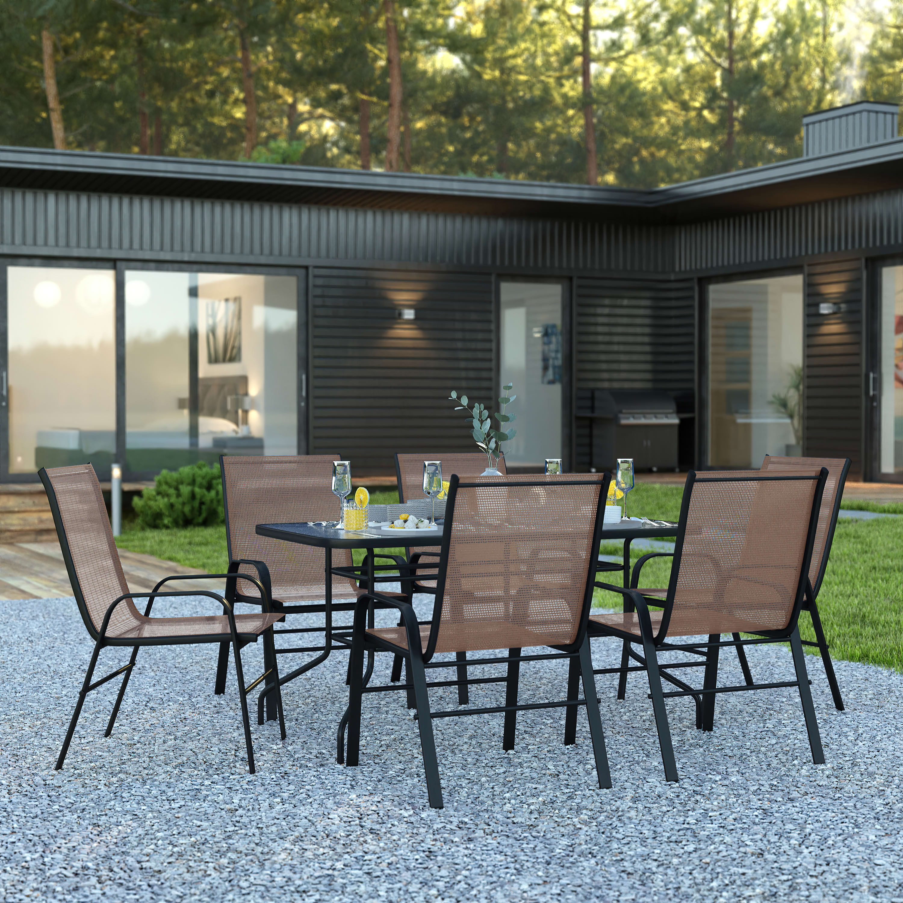 BizChair 7 Piece Outdoor Patio Dining Set - 55" Tempered Glass Patio Table with Umbrella Hole, 6 Brown Flex Comfort Stack Chairs