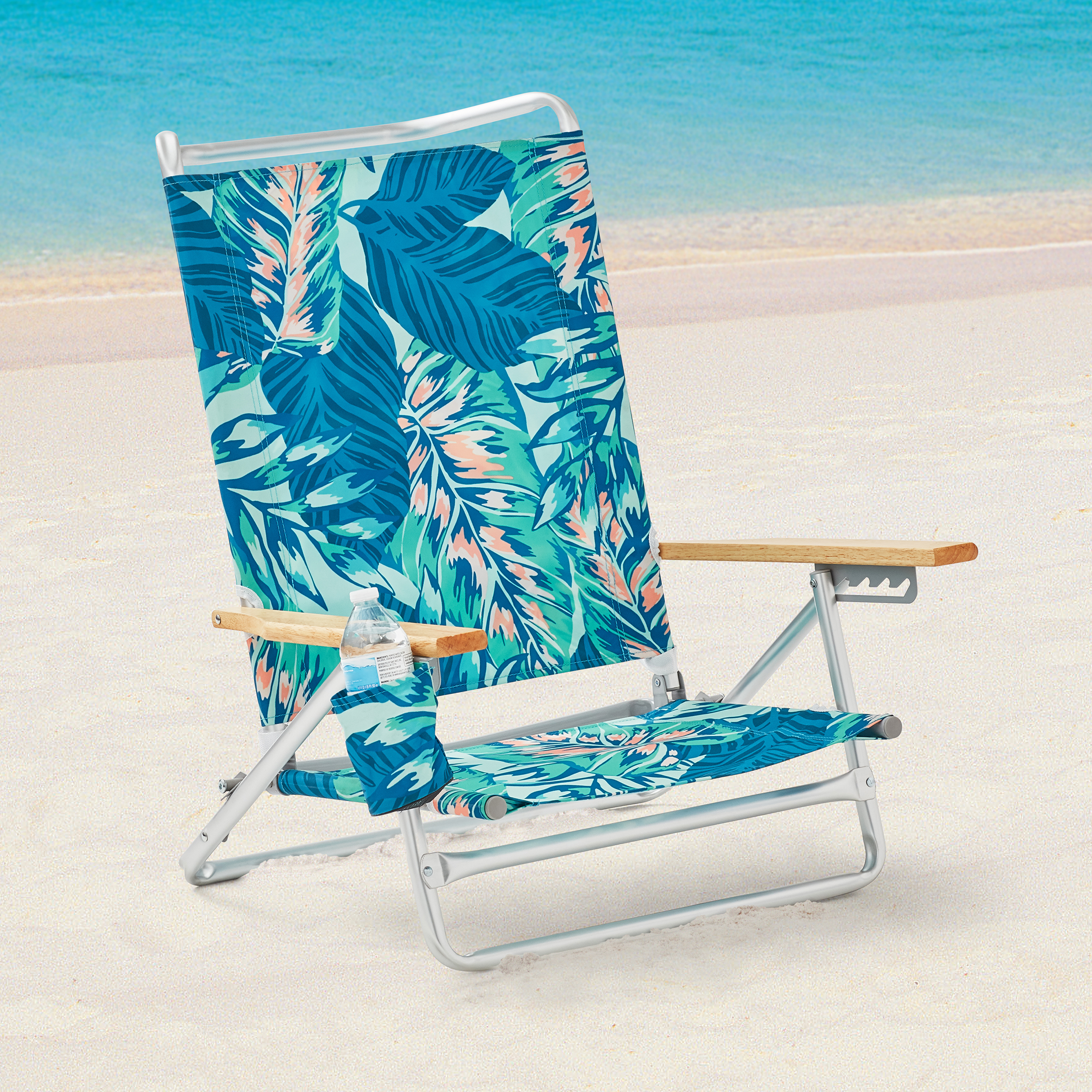 Mainstays Wood Arm Reclining Lay-Flat Beach Chair, Green Palm