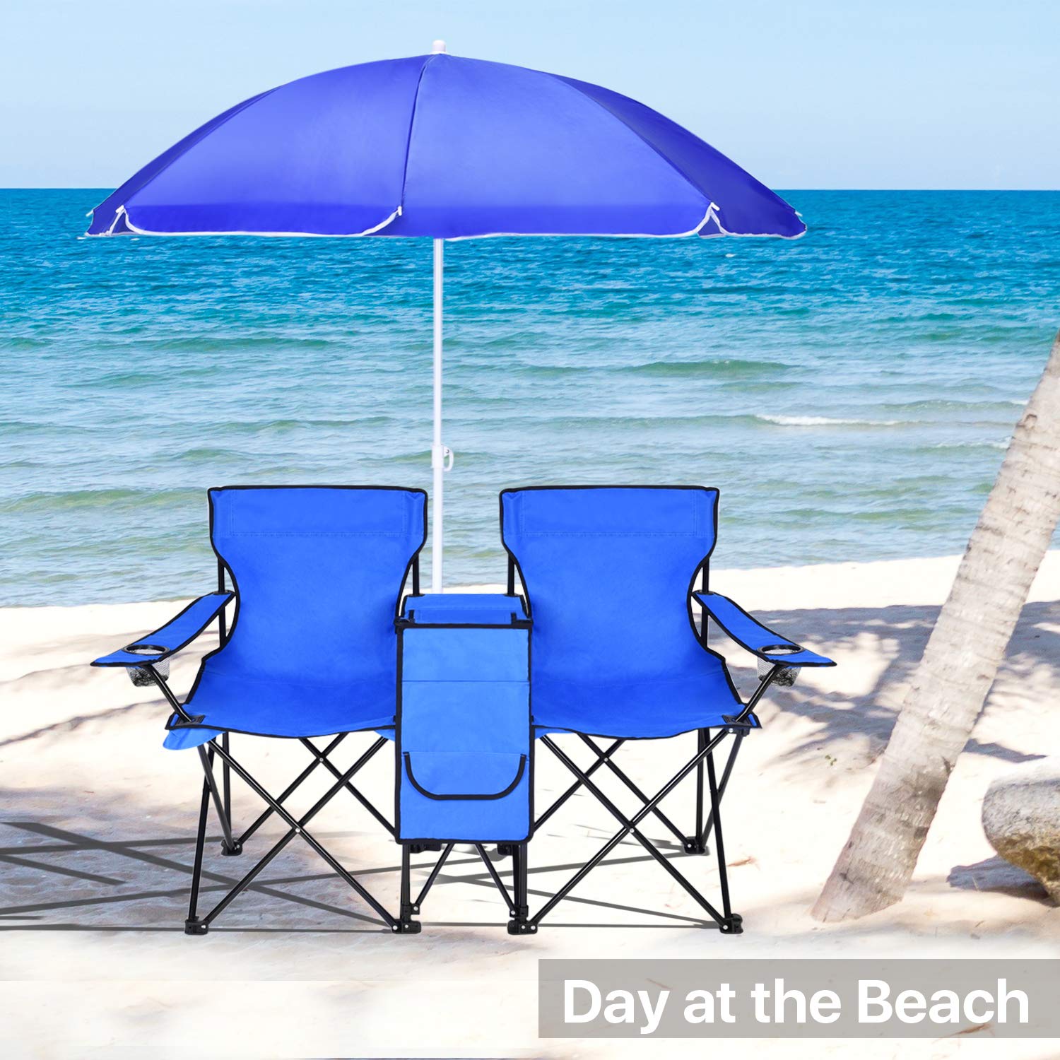 Beach Chair With Canopy, Folding Camping Chairs with Umbrella and Table Cooler, Portable Double-Chair with Beverage Holder for Beach, Camping, Picnic, Patio, Pool, Park, Outdoor, Blue, I5418