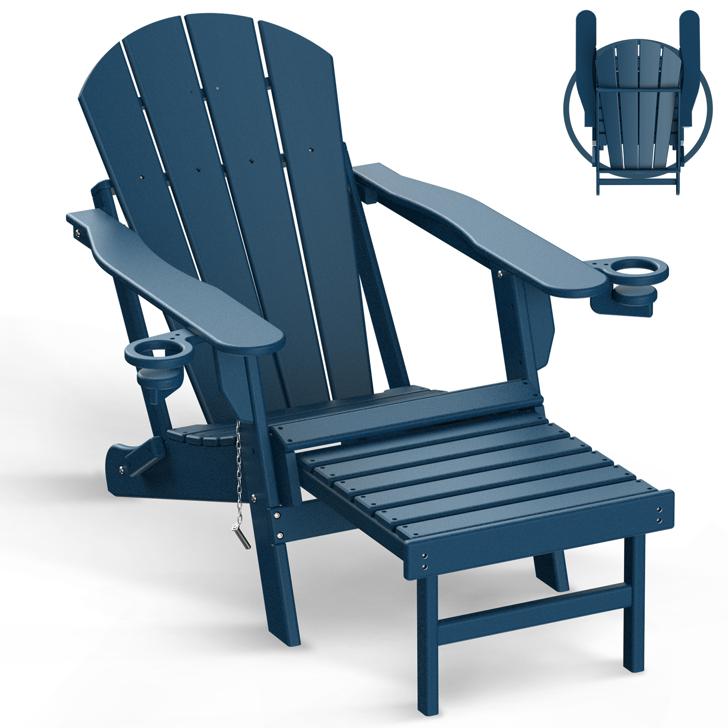 Folding Adirondack Chair with Ottoman, HDPE All-Weather Poolside Chairs w/Cup Holders & Footrest, Blue