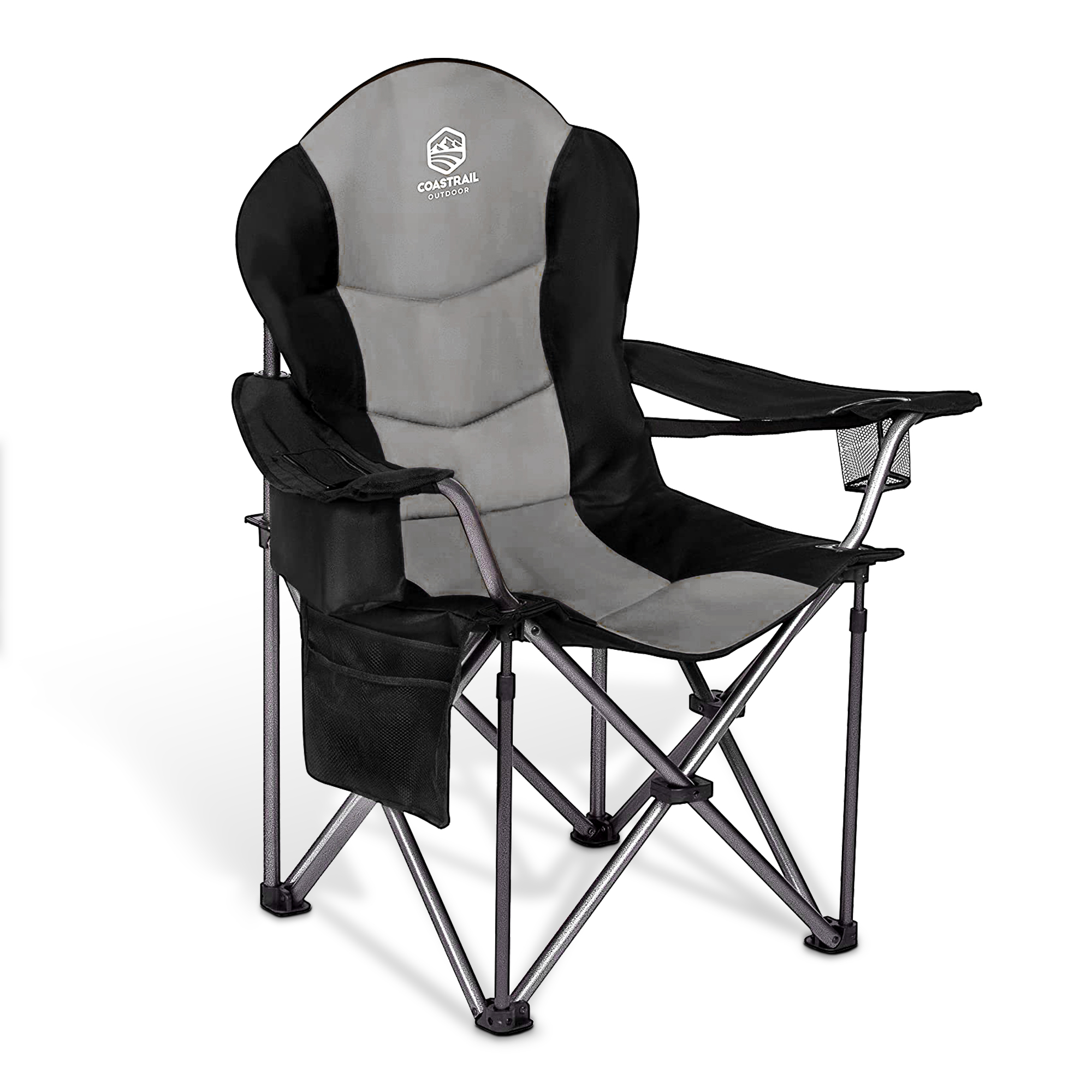 doubob Camping Chair Oversized Padded Folding Quad Arm Chairs with Lumbar Back Support, Cooler Bag, Cup Holder & Side Pocket, Extra Head Pocket Black&Light Gray