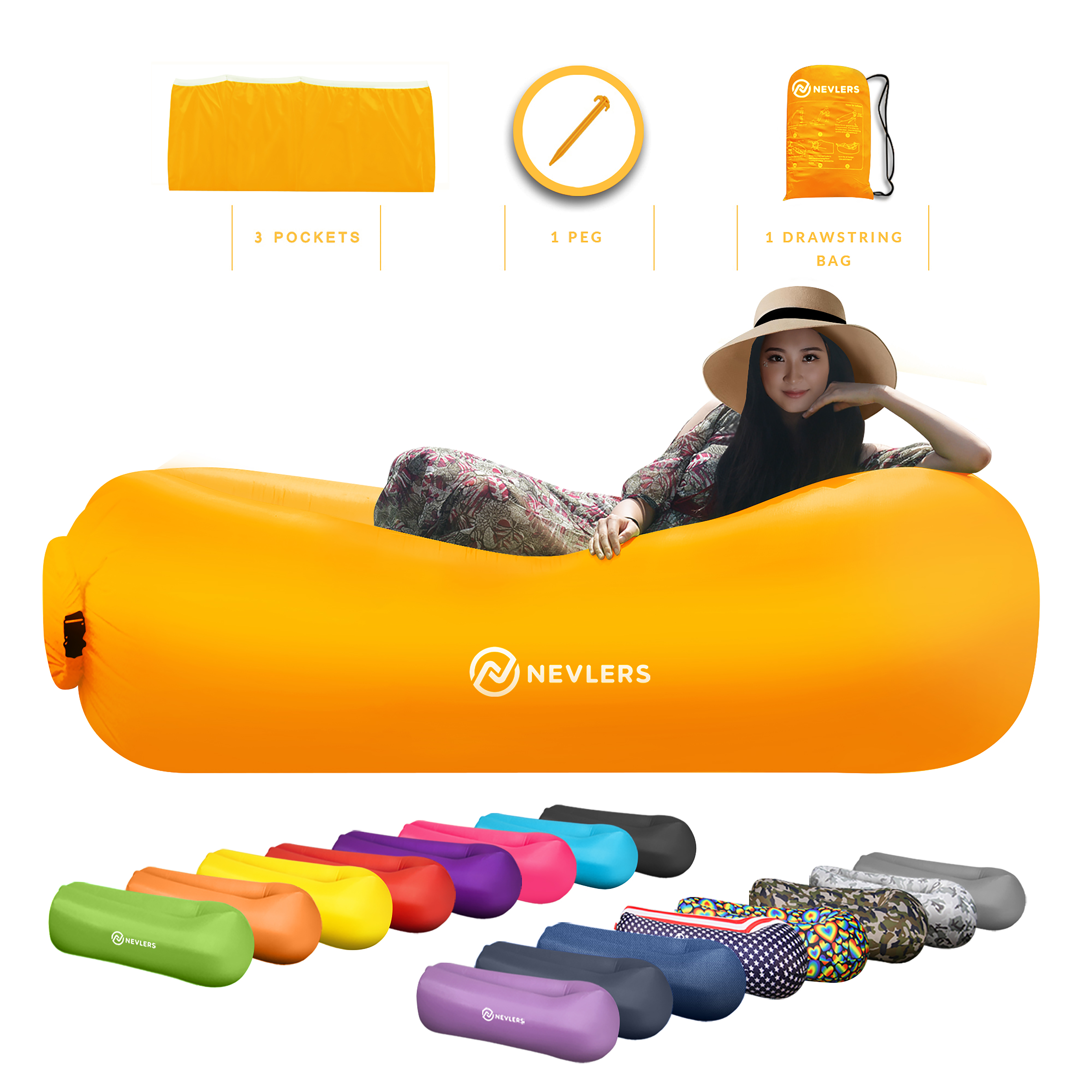 Nevlers Saffron Yellow Inflatable Lounger | Portable Beach Chair with Matching Travel Bag & Pockets | Polyester