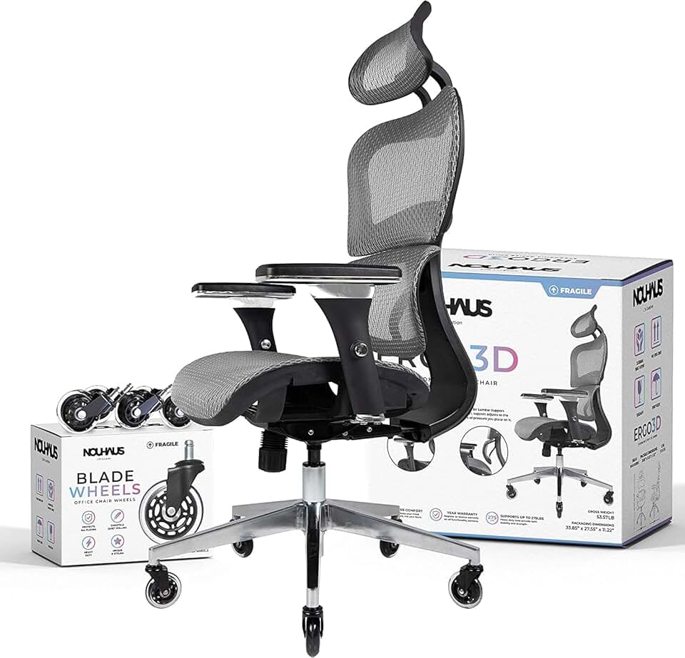 Nouhaus Ergo3D Ergonomic Office Chair Lumbar Support Mesh Office Chair with 4D Adjustable Armrest, Adjustable Headrest and Wheels, Mesh High Back Home Office Desk Chairs (Grey)