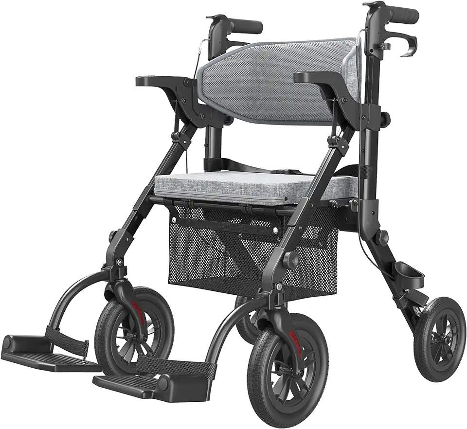 Rollator-Walkers-for-Seniors-with-Seat, Walker Wheelchair Combo, Transport-Wheelchair-Lightweight-Foldable, Adult Walkers All Terrain, 2 in 1 Rolling Walker Chair with Brakes & Pouch-2024 New