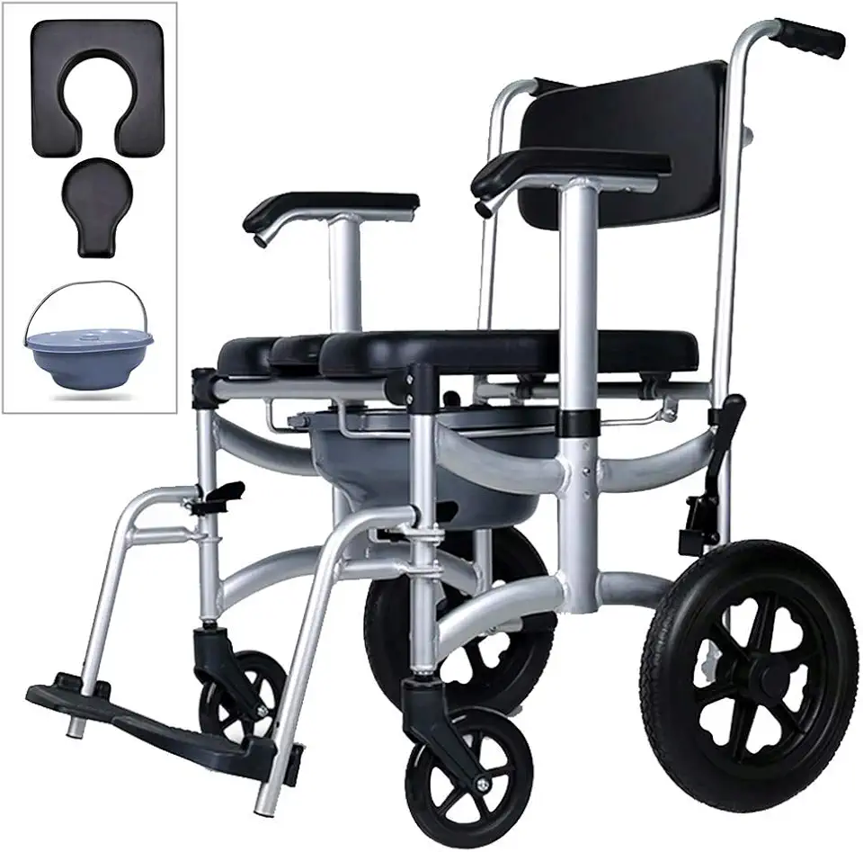 Mobile Shower Chair, 4-in-1 Toilet Commode Wheelchair with Brakes, Removable Pedal, Adjustable Armrest, PU Backrest Cushion and Pail 330lb