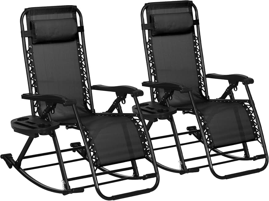 2 Pieces Outdoor Rocking Chairs, Foldable Reclining Zero Gravity Lounge Rocker with Pillow, Cup & Phone Holder, Combo Design with Folding Legs, Black