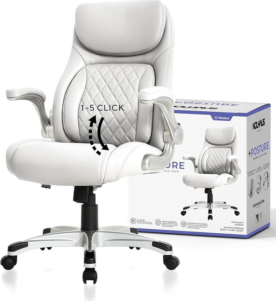 Nouhaus +Posture Ergonomic PU Leather Office Chair. Click5 Lumbar Support with FlipAdjust Armrests. Modern Executive Chair and Computer Desk Chair (White)