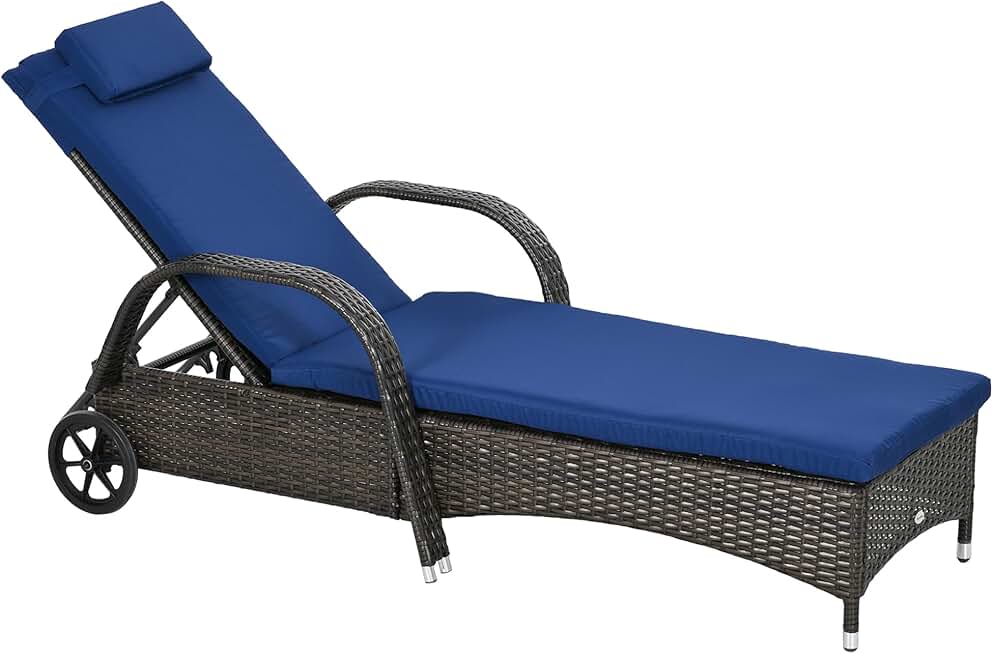 GOWE Wicker Outdoor Chaise Lounge, 5-Level Adjustable Backrest PE Rattan Pool Lounge Chair with Wheels, Cushion & Headrest, Brown and Dark Blue