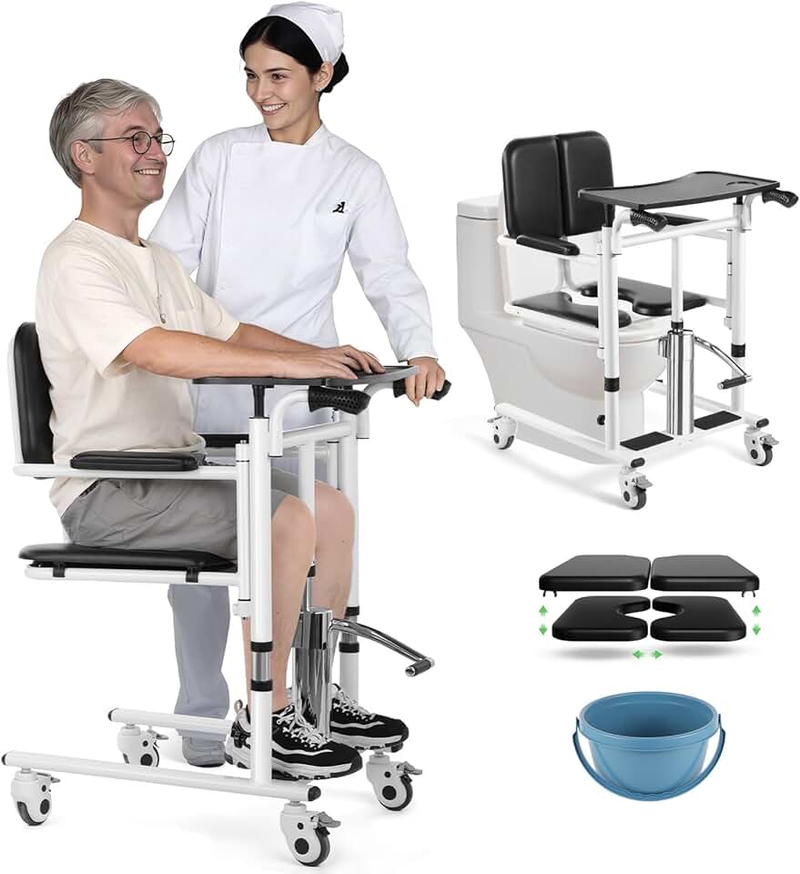 Patient Lift Wheelchair, 4 in 1 Transfer Wheelchair, Bedside Commode Toilet for Home and Hospital Care, Shower Chair for Elderly and Disabled, 180° Split Seat, Loading 330lbs