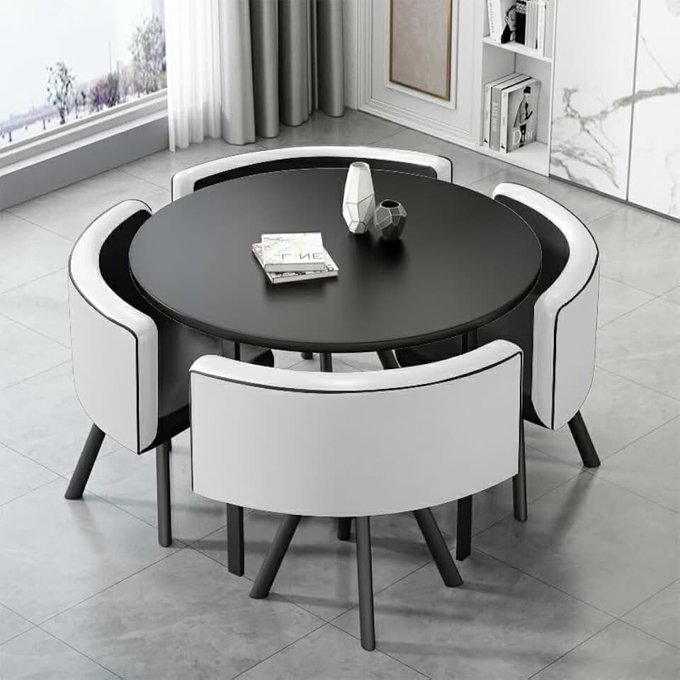 LITFAD Dining Room Table and Chairs for 4 Modern Coffee Table Set with 4 Upholstered Chairs Negotiating Table Set - 5 Piece Set Black Round Table & Black-White Chair(s) 31.5" L x 31.5" W x 29.5" H