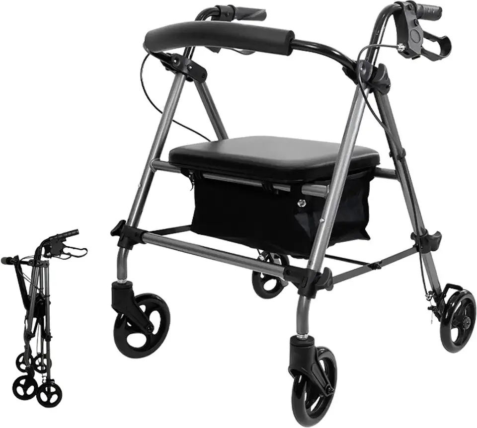 Rollator Walker with Soft Seat - Transport Chair Rolling Walker with 6-inch Wheels - Foldable Walking Aid with Height Adjustable Handles - 300lbs Support