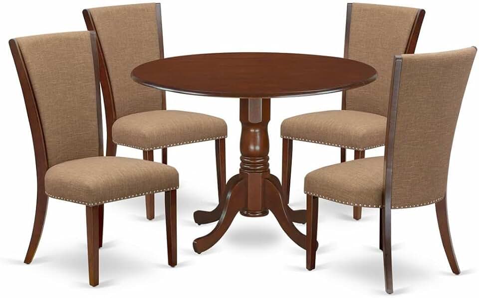 East West Furniture Dublin 5 Piece Room Set Includes a Round Kitchen Table with Dropleaf and 4 Light Sable Linen Fabric Parson Dining Chairs, 42x42 Inch, Mahogany