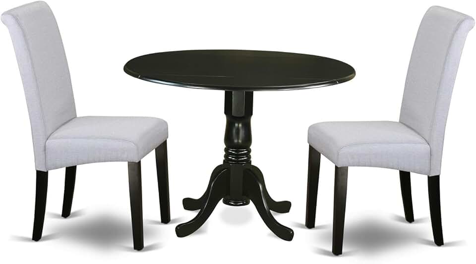 East West Furniture DLBA3-BLK-05 3 Piece Kitchen Table & Chairs Set Contains a Round Dining Room Table with Dropleaf and 2 Grey Linen Fabric Parsons Dining Chairs, 42x42 Inch, Black