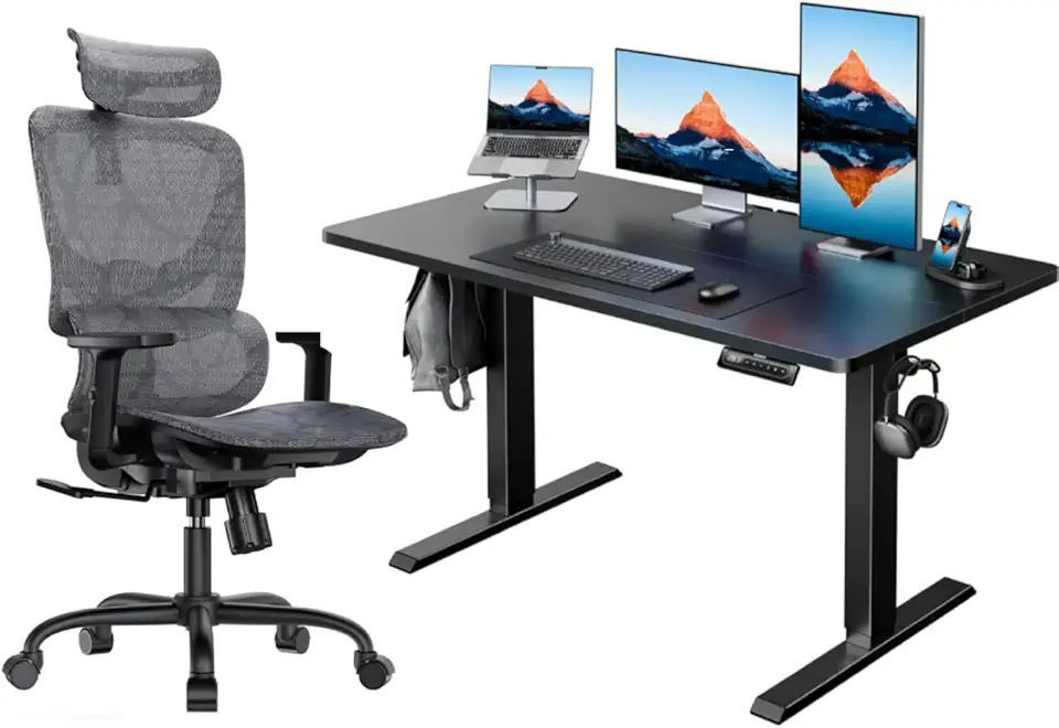 HUANUO Electric Standing Desk Adjustable Height, 4 Memory Height Settings, Headphone Hook with Ergonomic Mesh Office Chair, High Back Desk Chair with Adjustable Lumbar Support