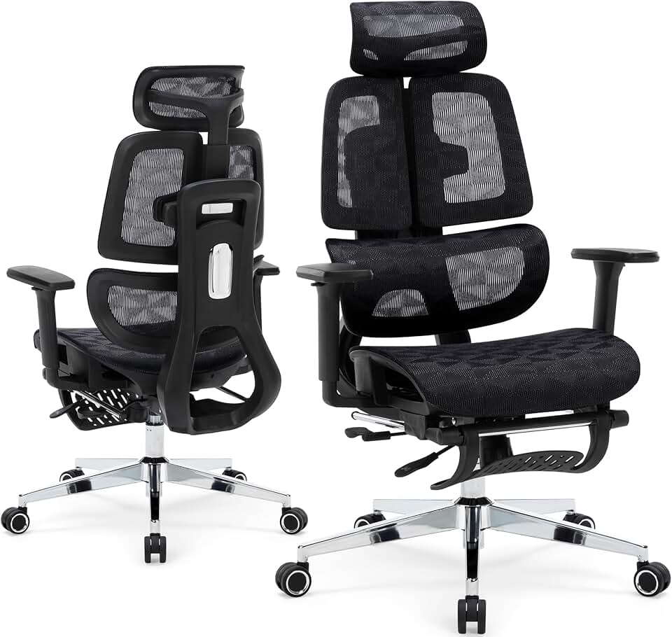 Ergonomic Dual Backrest Office Chair with Footrest- High Back Mesh Desk Computer Chair with Adjustable Seat Depth and Adaptive Lumbar Support, 4D Arms Metal Base Multifunctional Executive Swivel Chair