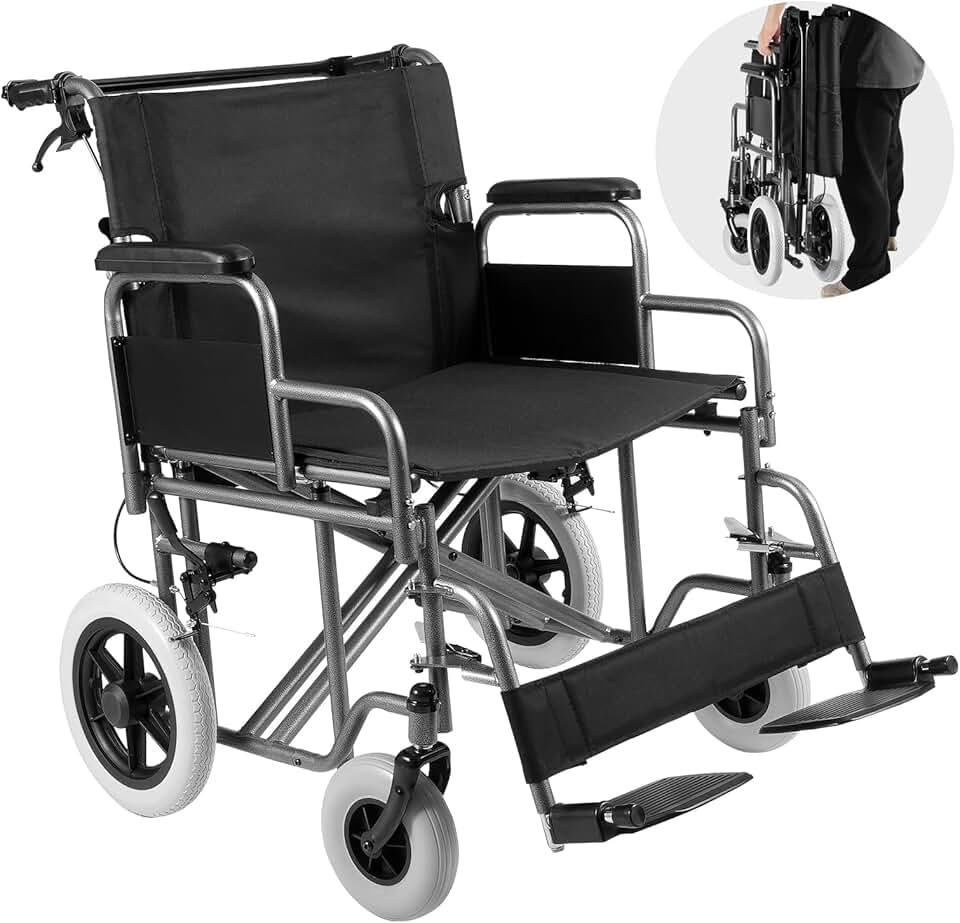 VEVOR Wheelchair, Carbon Steel Transport Chair for Adults, Foldable Wheelchair with Detachable Armrest, Self-Locking Brake, 24-Inch Wide Seat, 300lbs Weight Capacity, for The Disabled Move Freely