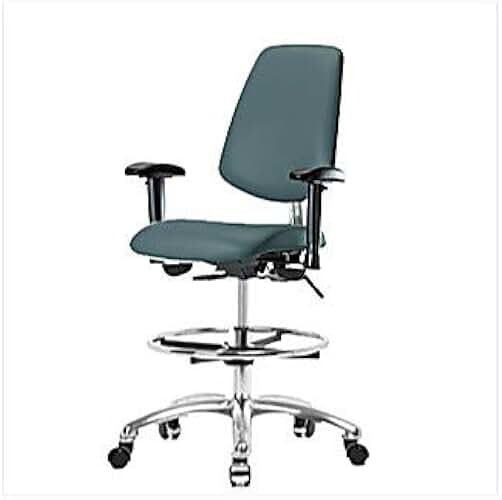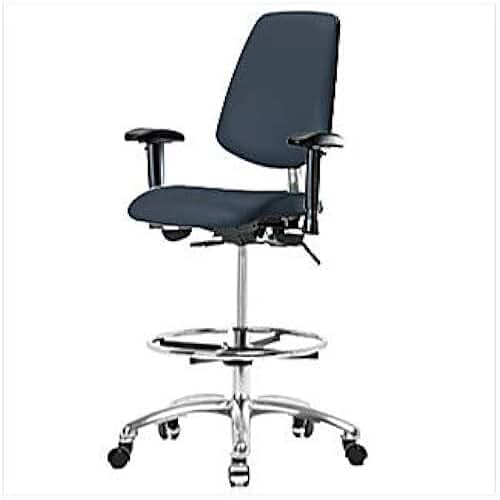 1163V09 Cleanroom Vinyl Medium Bench Height Chair with Medium Back, Chrome Base, Without Tilt, Adjustable Arms, Chrome Foot Ring, Chrome Casters, Imperial Blue