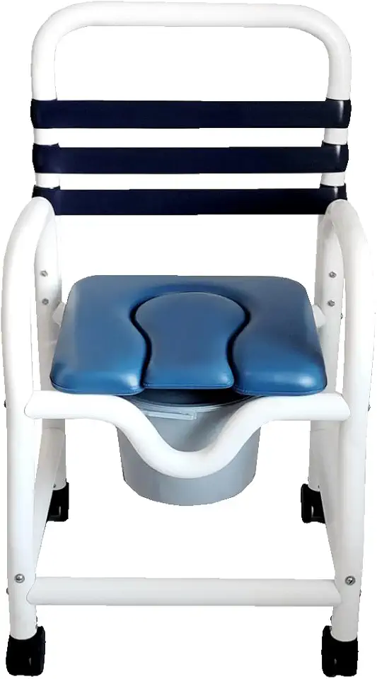 Deluxe New Era Patented Hygienic Access Shower Commode Chair, 18" Int. Width, Open Front Removable Soft Seat, Commode Pail, 3" Twin Locking Casters, 310 lbs wt Capacity