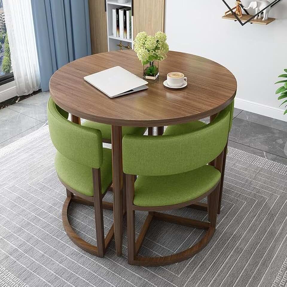 LITFAD Modern Dining Room Table and Chairs for 4, Round Wood Top Dining Set with Upholstered Chairs and Iron Base 5 Piece Coffee Table Set - 5 Piece Set Walnut Table & 4 Green Chair(s)