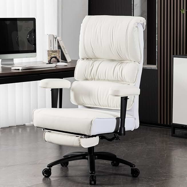 Big and Tall Office Chair 400LBS, High Back Executive Office Chair Wide Seat, Ergonomic Office Chair with Foot Rest, Leather Office Chair Lumbar Support for Back Pain Relief, White