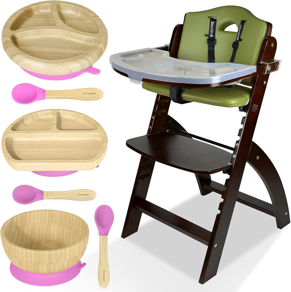 Abiie Beyond Junior Wooden High Chair with Tray (Mahogany Wood/Olive Cushion) and Octopod Bamboo Plates with Suction & Bamboo Bowl with Suction (Pink) - High Chair and Bamboo Plates and Bowl Bundle
