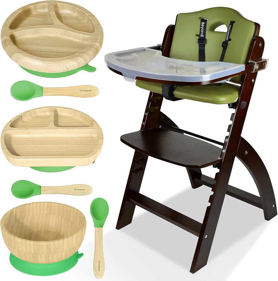 Abiie Beyond Junior Wooden High Chair with Tray (Mahogany Wood/Olive Cushion) and Octopod Bamboo Plates with Suction & Bamboo Bowl with Suction (Green) - High Chair and Bamboo Plates and Bowl Bundle