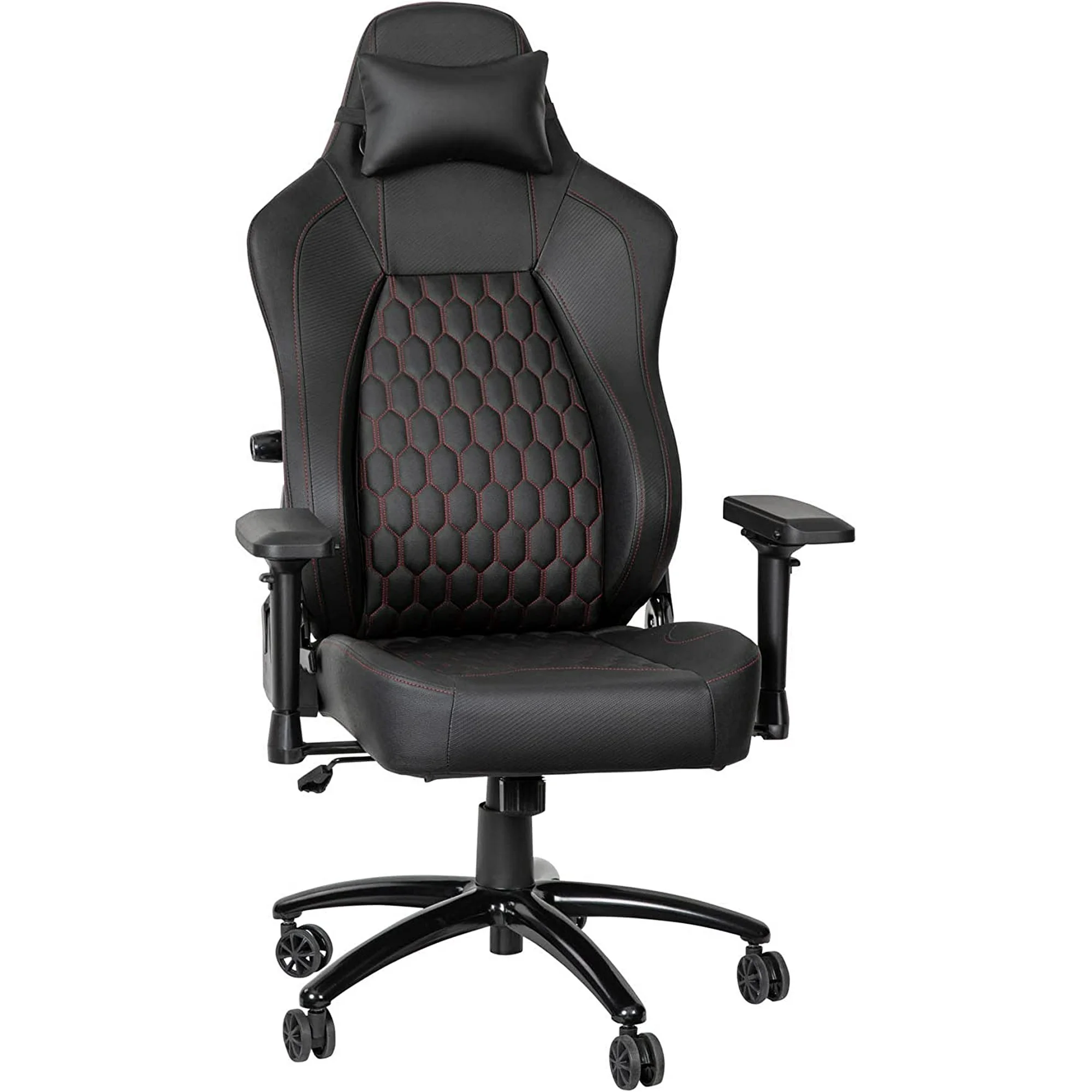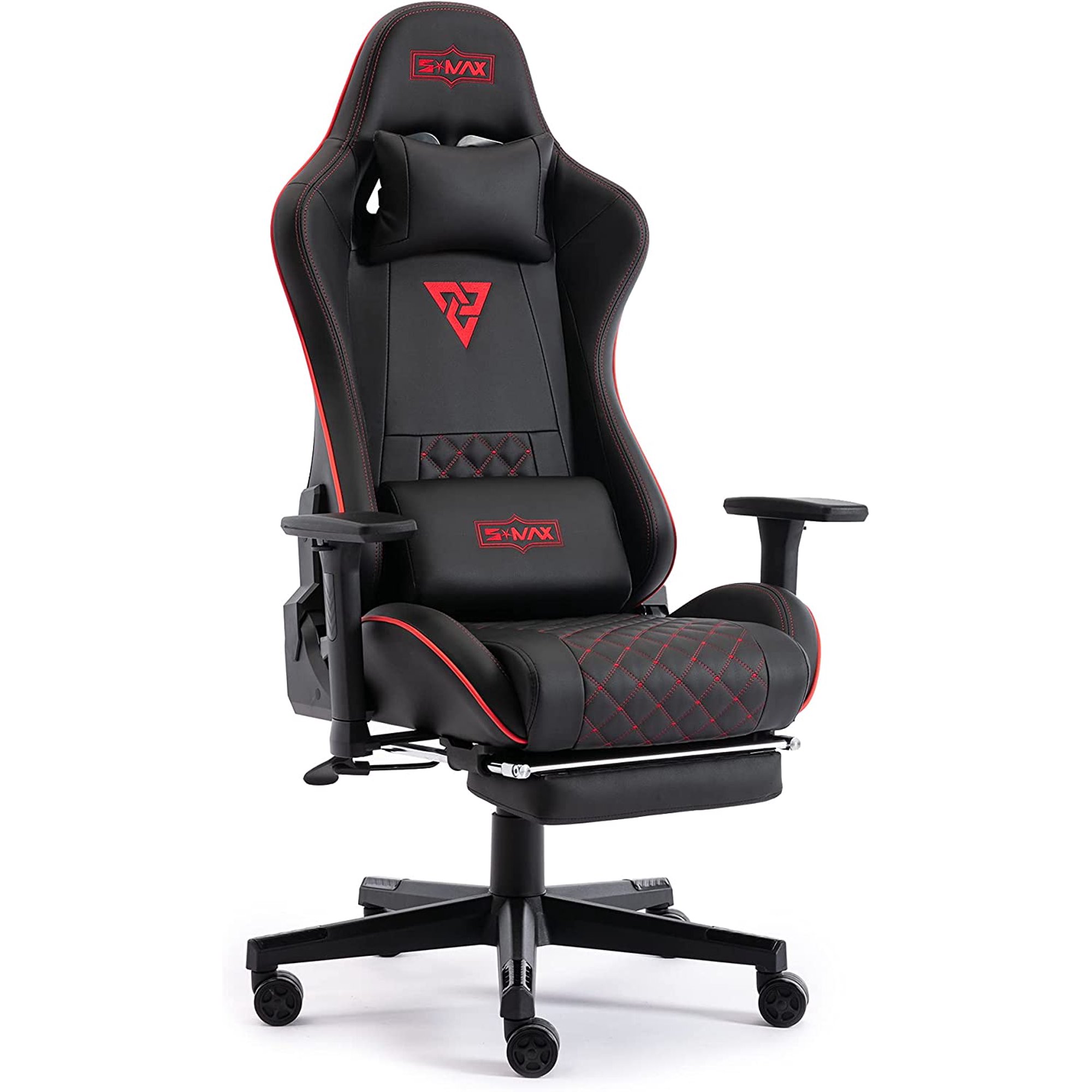 KEMANHUAN Falco Ergonomic Adjustable Gaming Chair - Black LeatherSoft/Red Stitching - High Back - 4D Armrests - Headrest Pillow - Adjustable Lumbar Support