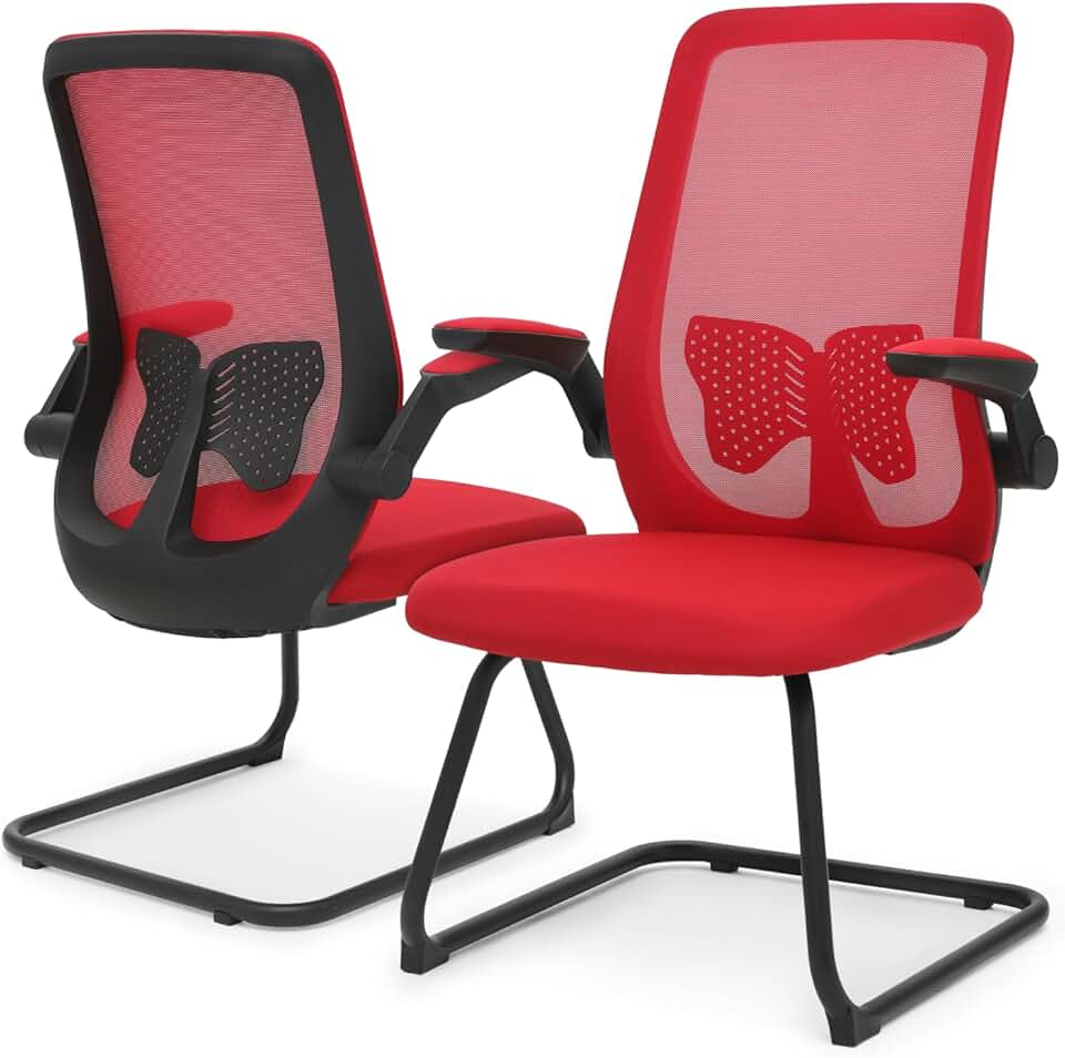 MoNiBloom Office Guest Chair Without Wheels, Lumbar Support Sled Chair Ergonomic Middle Back Task Chair with Flip-Up Arms for Reception Conference Wait Room 250 LBS Capacity, Set of 2, Red