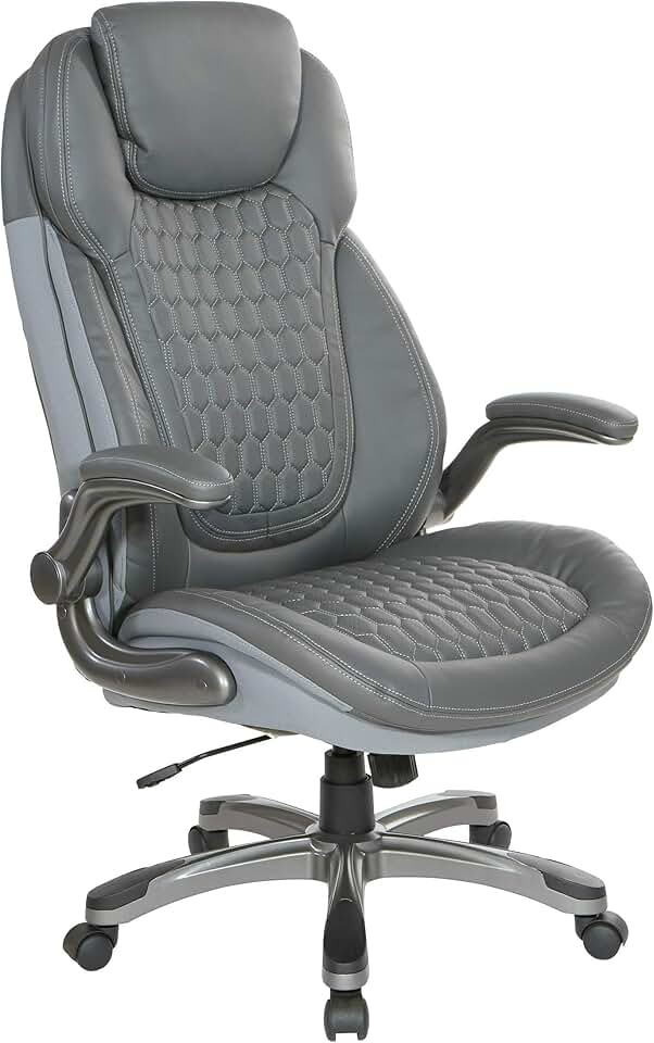 Office Star ECH Series Deluxe Executive High Back Bonded Leather Chair with Adjustable Seat and Padded Flip Arms, Grey with Titanium Nylon Base