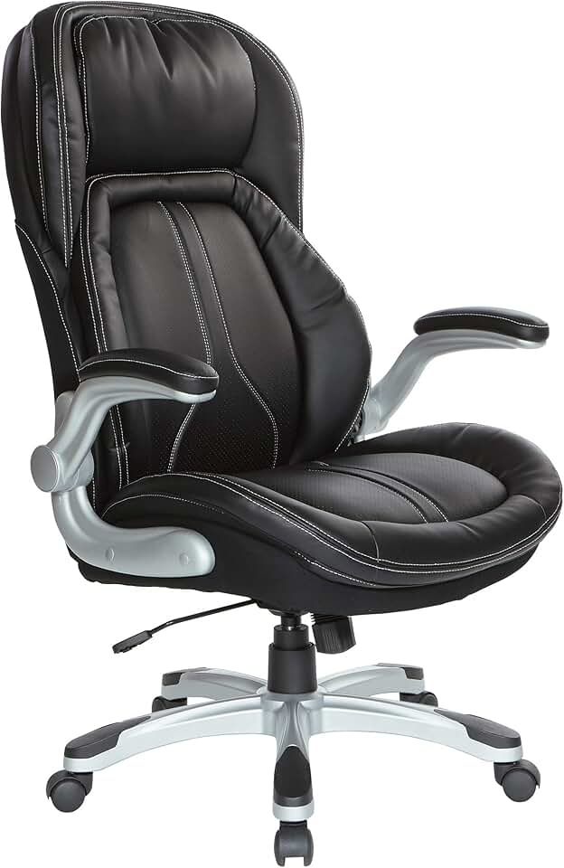 Office Star ECH Series Deluxe Executive High Back Bonded Leather Chair with Built-in Lumbar Support and Padded Flip Arms, Black with Silver Nylon Base