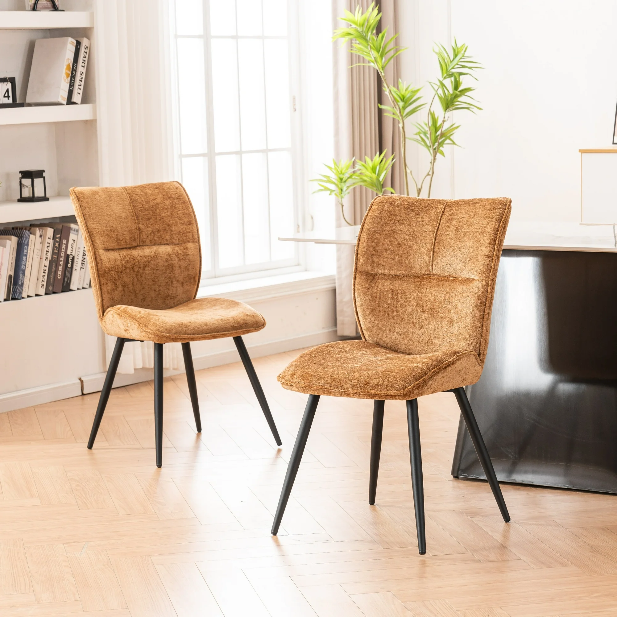 Kidol & Shellder Set of 2 Dining Chairs, Upholstered Side Chair, Armless Chair with Curved Backrest, Black Metal Legs, Caramel