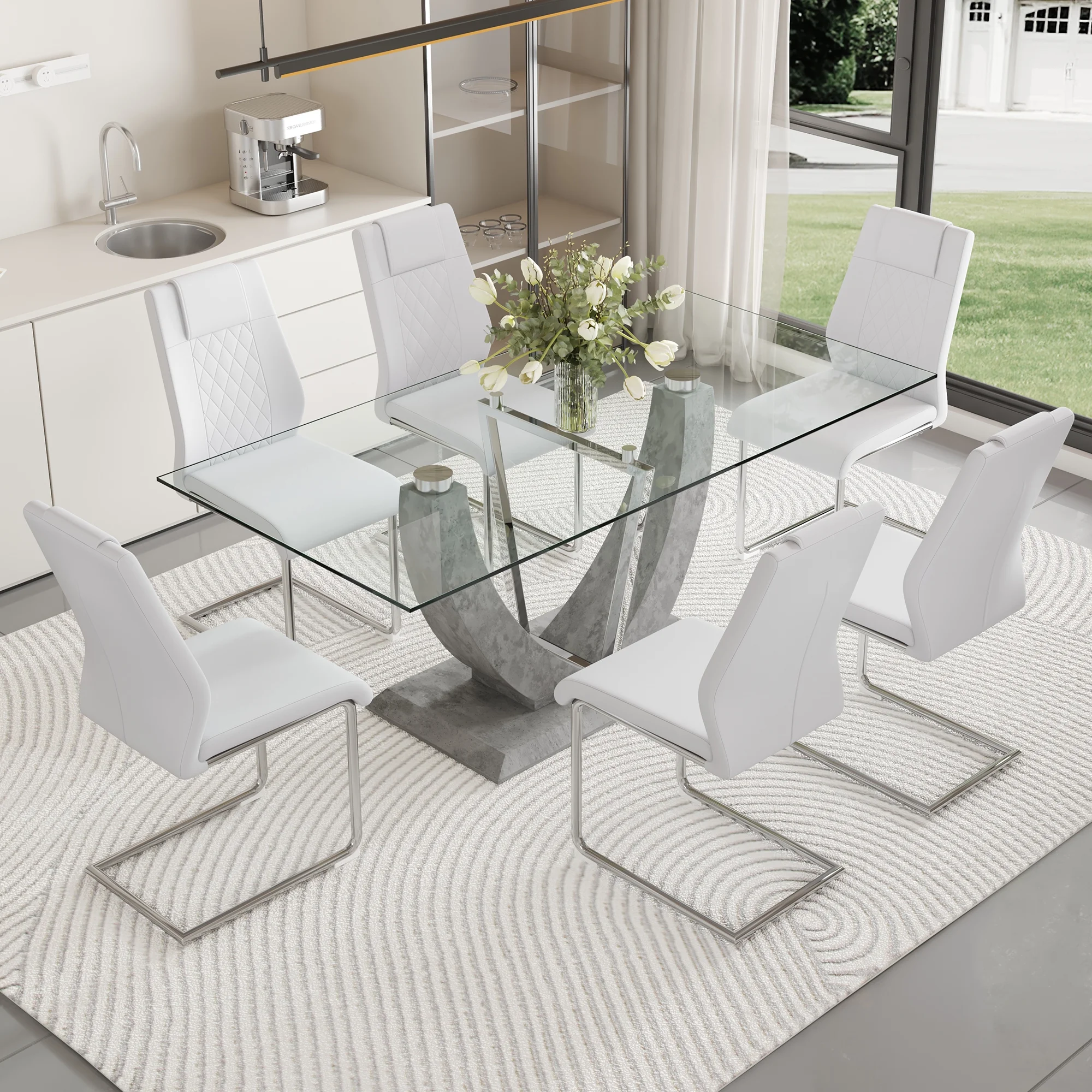 Large Rectangular Dining Set: Table with 0.39-Inch Tempered Glass Top and MDF Legs, Includes 6 Faux Leather Padded Chairs with Metal Legs