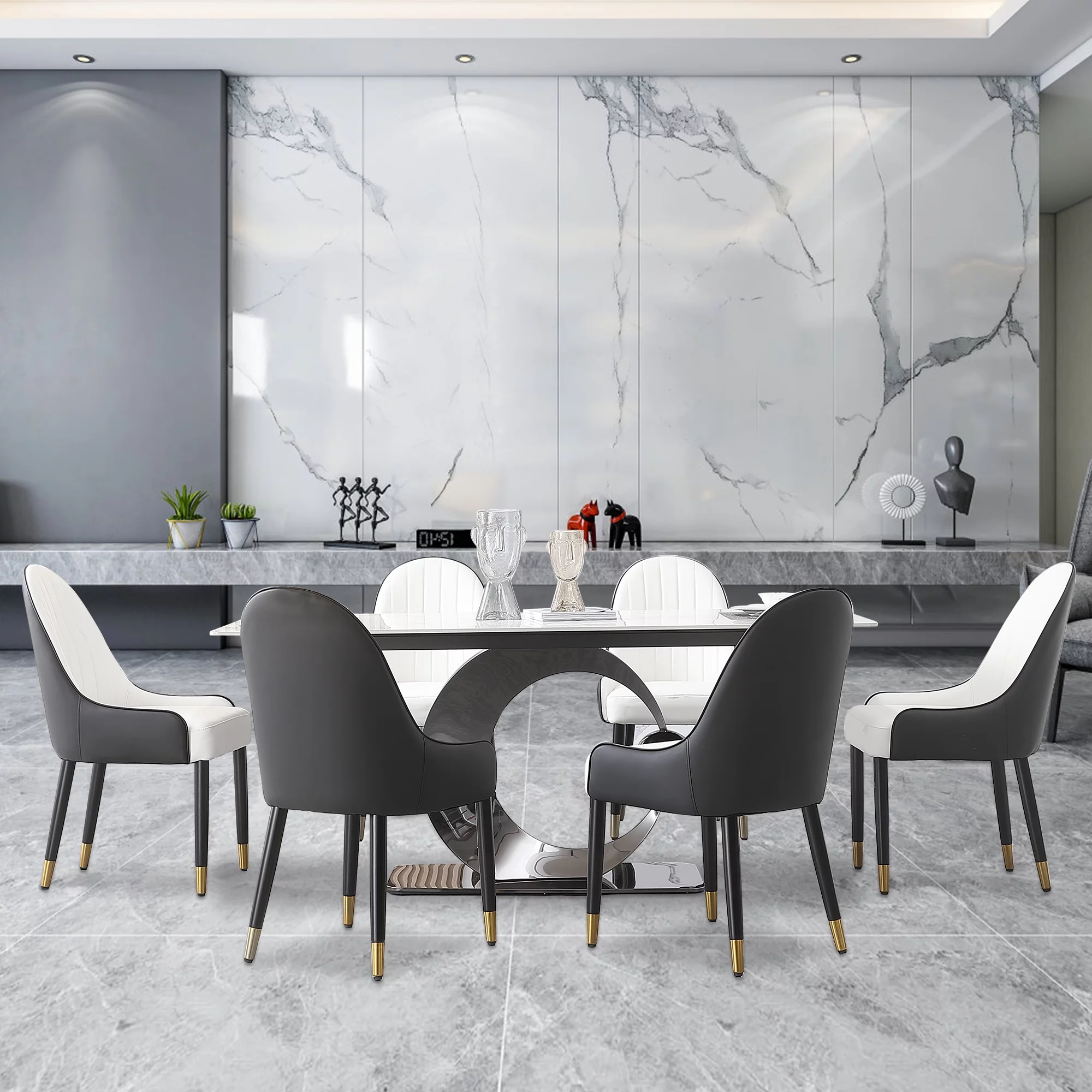 Leavader 71” White Sintered Stone Home Kitchen Dining Table Set for 6 People with Black Moon-shaped Stainless Steel Base with 6 Chairs