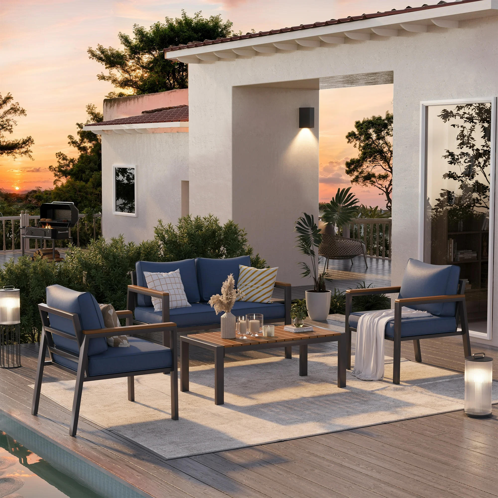 Poteban Aluminum Patio Furniture Set, Modern Metal Outdoor Patio Furniture, 5 Pcs Patio Conversation Sets with Wood Top Armrest & Table for Poolside, Deck, Black&blue (Included Waterproof Covers)