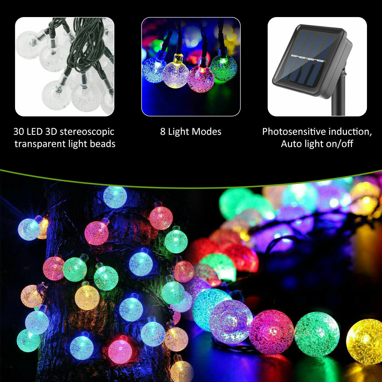 Dazone 21FT LED Solar Powered String Lights Garden 30 Bulbs Fairy Outdoor Patio Party Yard Path Decor Ball Lamp Waterproof US Plug(Colorful)