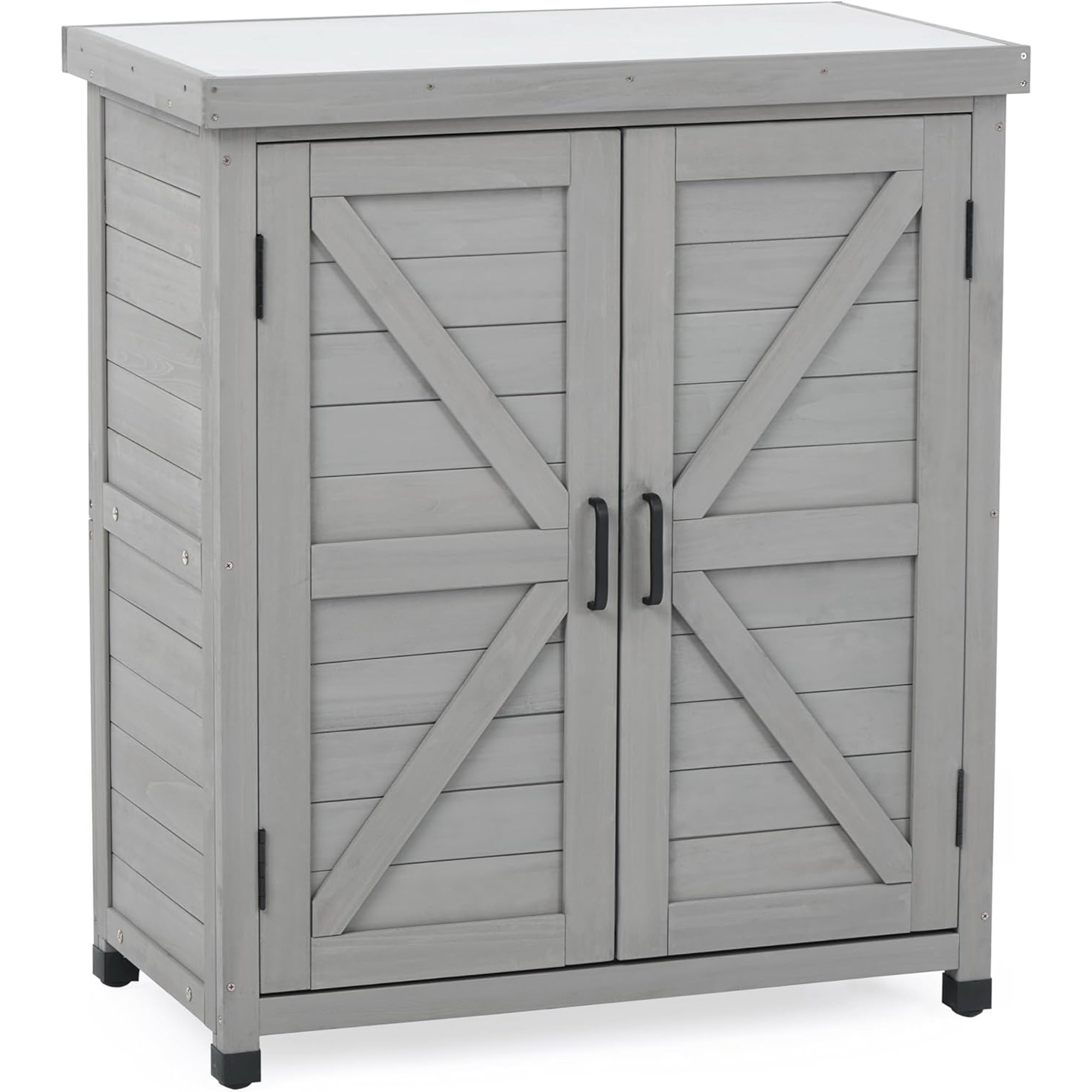 Potting Bench with Storage Cabinet and Metal Table Top for Outdoor Patio, Garden Furniture Wood Workstation