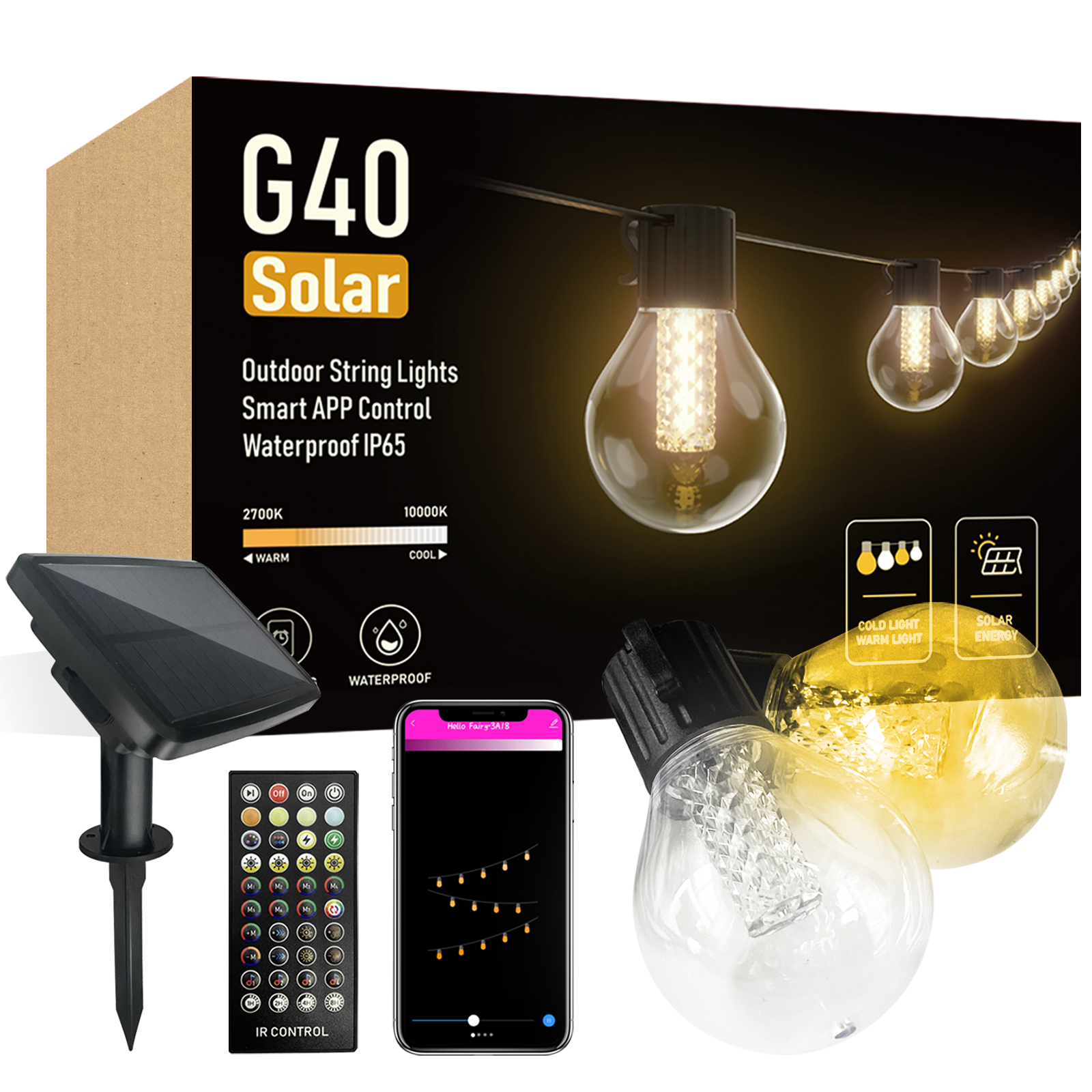 Avatar Controls Solar Smart Lights String Lights App Controlled 55FT(50+5) Warm/Cool White Dimmer Waterproof Remote Timer Music USB Charging G40 25 Globe Light Bulbs Custom Display for Patio Pergola