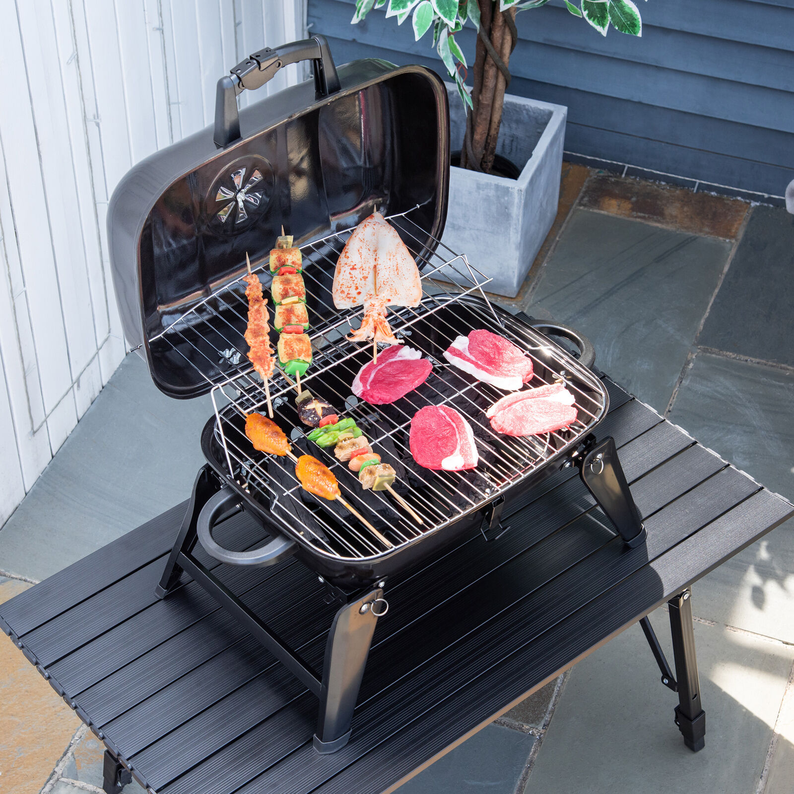 FOCUSSEXY Outdoor Charcoal BBQ Grill, Portable Small Grills and Smokers Folding Tabletop Grills, for Camping Patio Backyard and Anywhere Cooking, Black