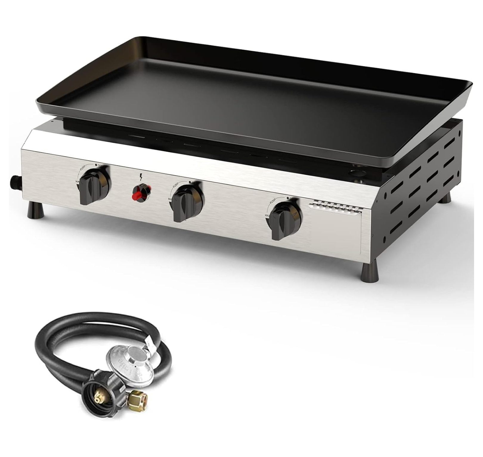 Drevy 25.6" 3-Burner Stainless Steel BBQ Grill, 30,000 BTU Portable Propane Griddle, Patio Garden Grill w/ 2 Side Tables for Outdoor Cooking, Camping.
